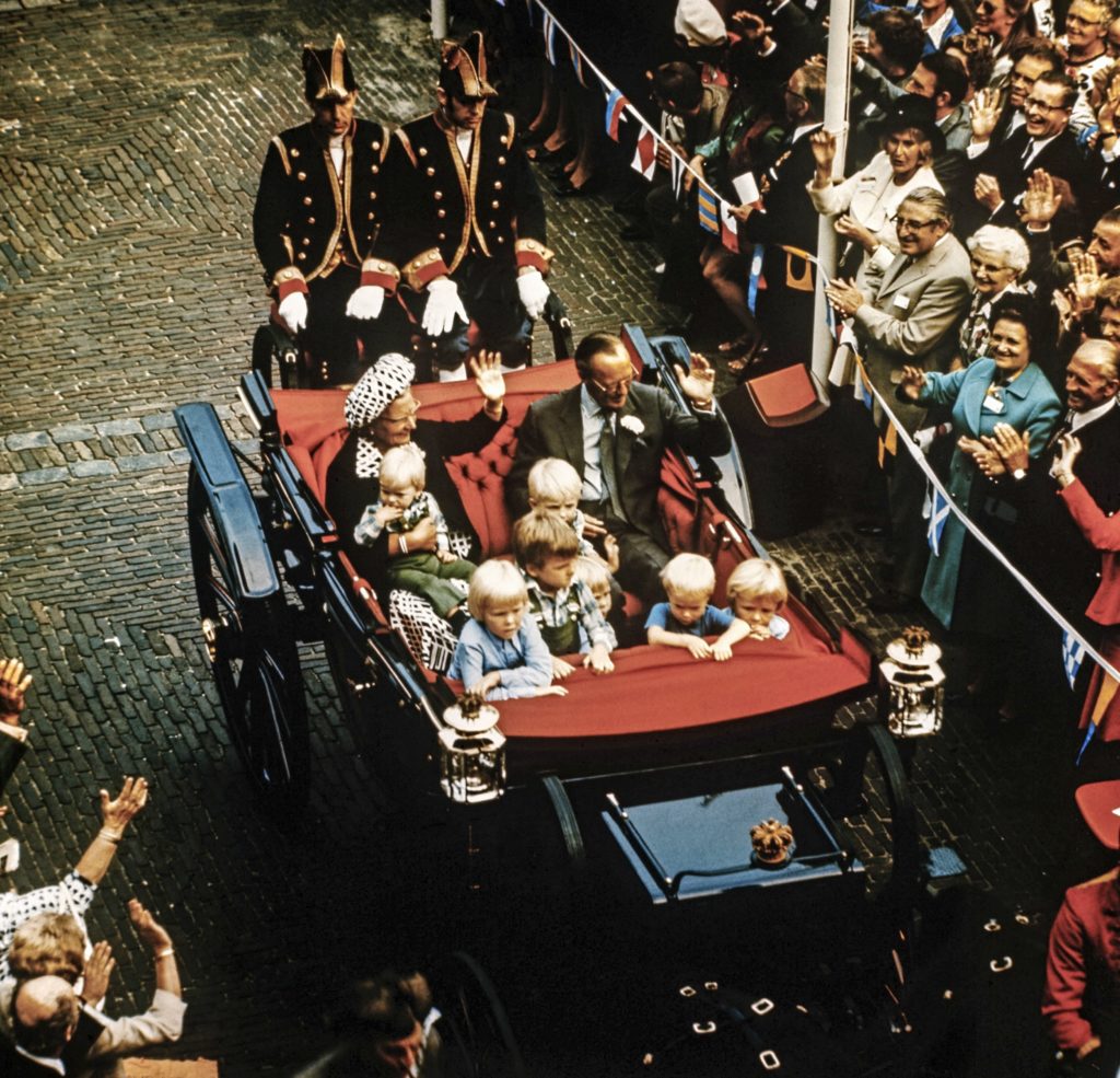 In Den Haag maken koningin Juliana en prins Bernhard met hun zeven kleinkinderen in een open rijtuig een rijtoer, enthousiast toegejuicht door een grote menigte. Pieter-Christiaan (bij oma Juliana op schoot), Willem-Alexander, Maurits, Bernhard, Constantijn (moeilijk zichtbaar), Carlos en Johan Friso.