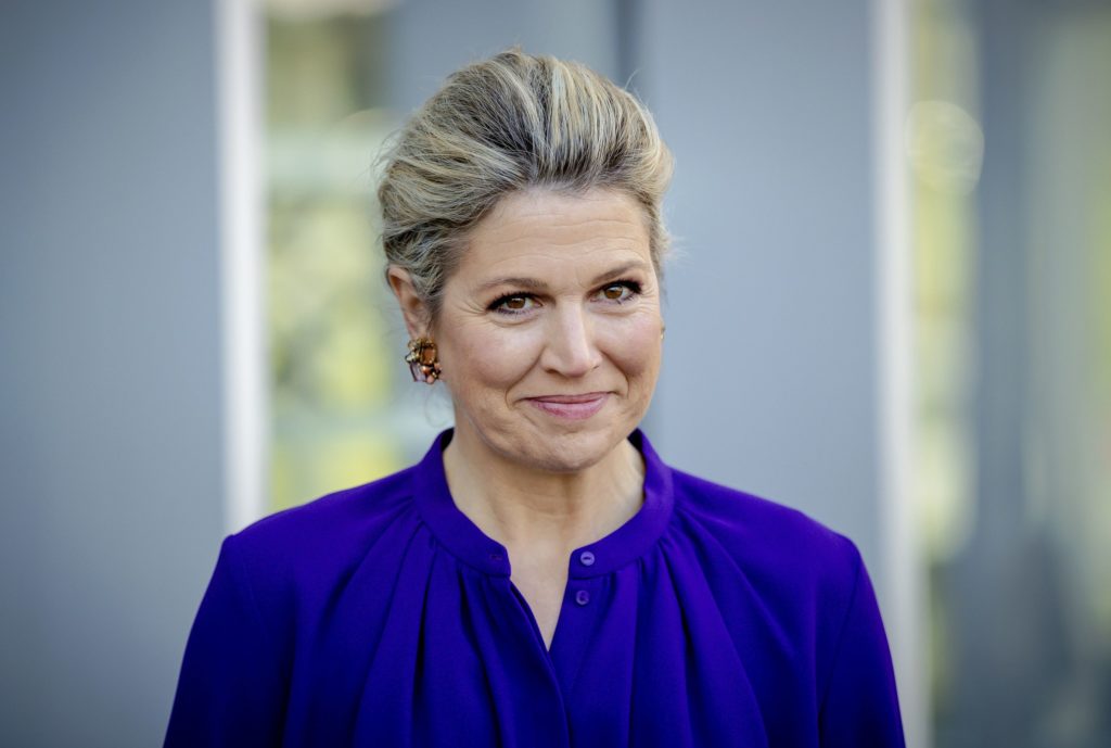 Koningin Máxima draagt de grote aquamarijn aan een strikbroche.