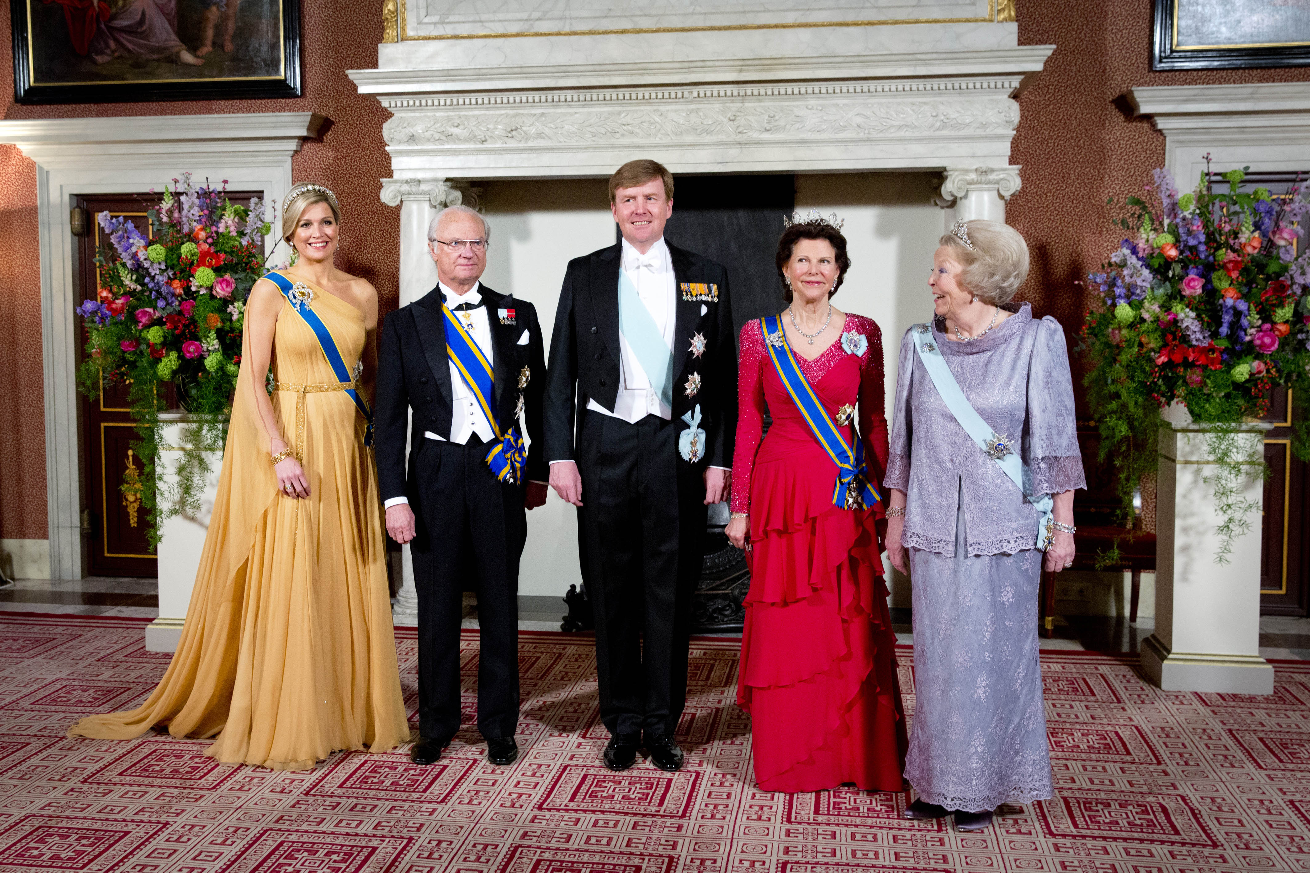 Máxima met de citrienen strikbroche tijdens het banket voor het Zweedse koningspaar: