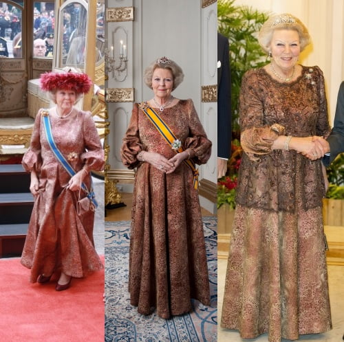 De aangepaste jurk die prinses Mabel zaterdag droeg bij de herdenking is slechts een van de vele voorbeelden van creaties die de prinsessen en koningin laten aanpassen. Deze week elke dag een voorbeeld van een aangepaste creatie. Met uiteraard daarbij de vraag welke versie u het mooiste vind. In het eerste deel van de serie kijken we naar de bruine jurk die prinses Beatrix, toen nog koningin, droeg tijdens Prinsjesdag 2009. Gecombineerd met juwelen van citrien een koninklijke japon, die we opnieuw zagen op het staatsieportret dat uitgegeven werd in april 2010.