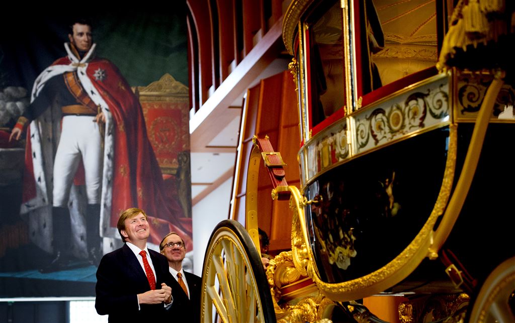 Plannen om de in 1826 in Brussel voor koning Willem I gebouwde koets weer voor deze gelegenheid te gebruiken zijn er dus niet. Willem-Alexander heeft de koets maandag na een jarenlange restauratie onthuld in het Louwman museum, waar het pronkstuk van de Koninklijke Stallen tot eind mei is te zien.