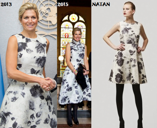 Koningin Máxima was vanmiddag bij de oratie van professor Couso, die in de periode 2014-2016 verbonden is aan de Prins Claus Leerstoel. Tijdens de oratie droeg de koningin een bekende japon uit de wintercollectie 2013 van modehuis NATAN.