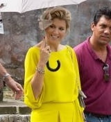 Tijdens de tweede dag van de kennismakingstoer aan het Caribisch gebied van het Koninkrijk verscheen koningin Máxima opnieuw in een creatie van modehuis Natan. Ditmaal een geel jurkje, die we eerder zagen tijdens Máxima’s bezoek aan Maleisië. Ook de schoenen en tas zijn van het Belgische modehuis, dat het grootste gedeelte van Máxima’s dagkleding levert. De fascinator is een ontwerp van Fabienne Delvigne, die de creatie al in 2009 ontwierp voor het staatsbezoek aan Mexico.