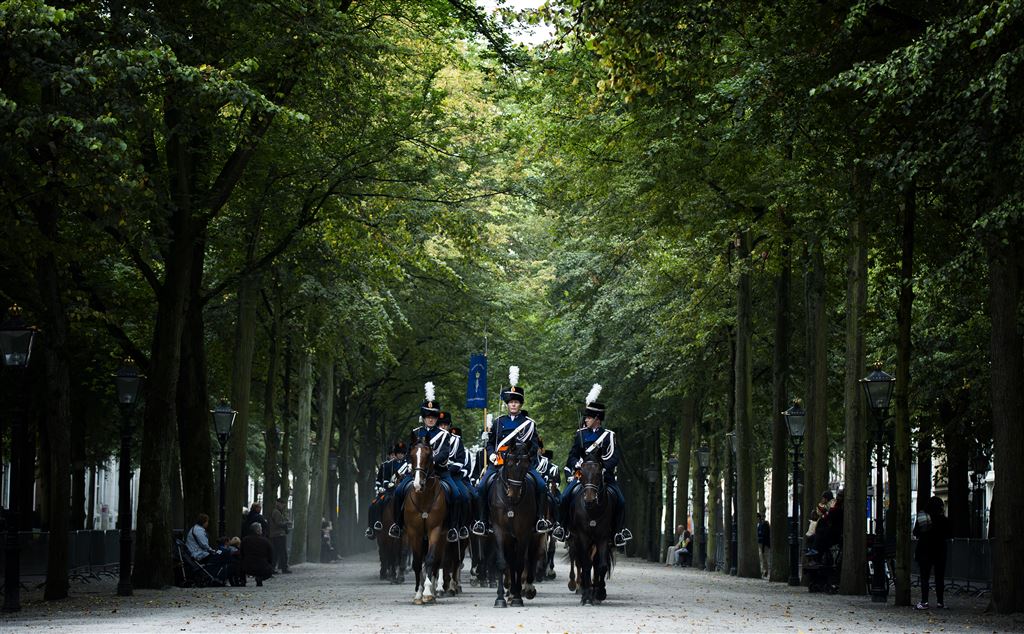 DEN HAAG – De paarden en ruiters van de marechaussee oefenen zaterdag op het Lange Voorhout in Den Haag voor Prinsjesdag. Zo kunnen de paarden wennen aan situaties die ze dinsdag tegen kunnen komen: harde muziek, sirenes van politiemotoren en vlaggen. Het trompetterkorps van de marechaussee luistert de oefening muzikaal op. De ere-escorte van de marechaussee opent op de derde dinsdag in september het bereden deel van de koninklijke stoet van Paleis Noordeinde naar het Binnenhof.