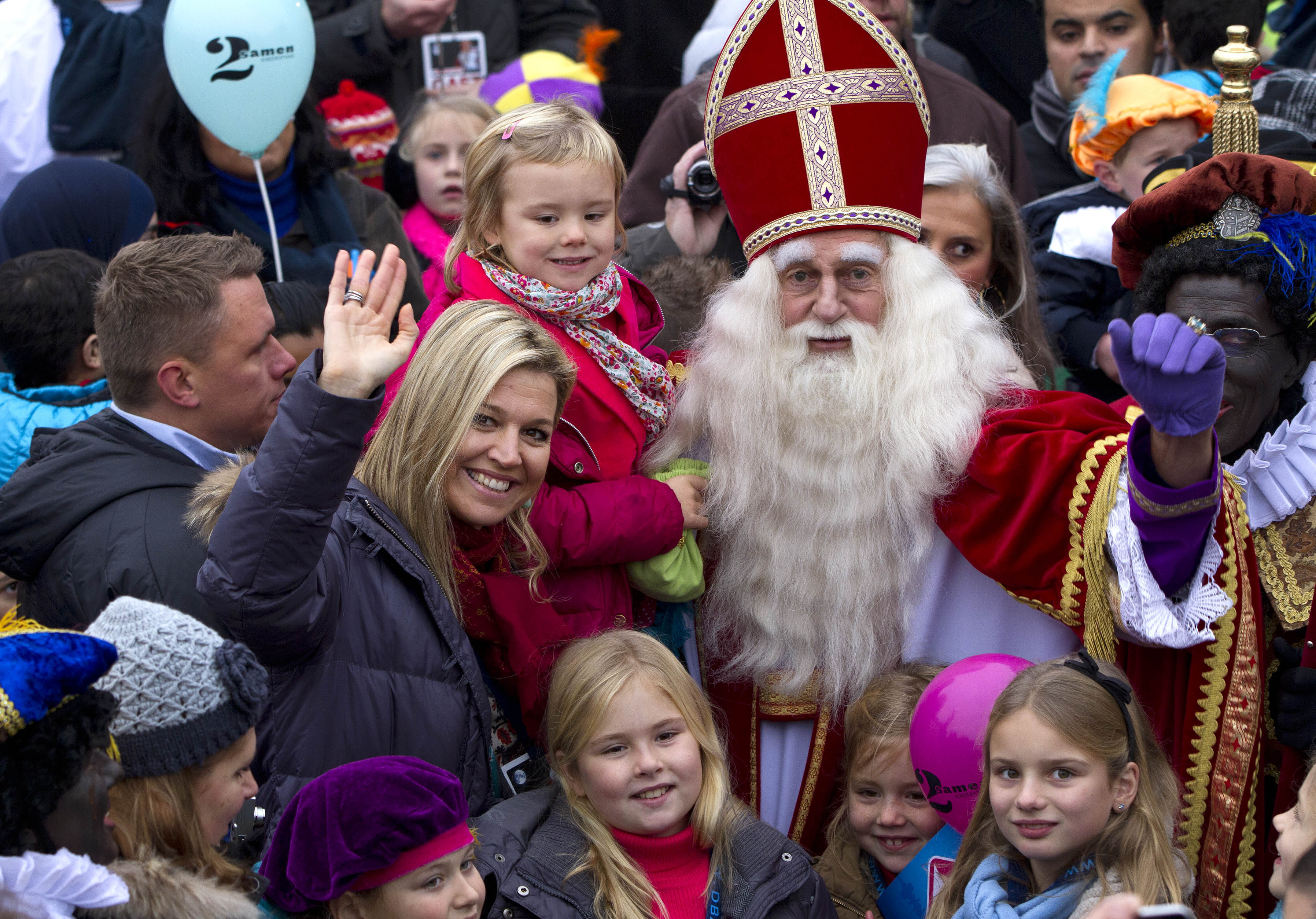 Sinterklaas is weer in het land! Ook onze prinsesjes hebben hem verwelkomd, in de haven van Scheveningen. Samen met enkele vriendinnetjes en hun moeder prinses Máxima wuifden ze enthousiast naar de goedheiligman. De sint nam uitgebreid de tijd om een handje te geven aan de prinsesjes en van Ariane kreeg hij zelfs een kus! Helaas moest Sinterklaas weer verder en reisden de prinsesjes boordevol enthousiaste verhalen terug naar de Eikenhorst.
