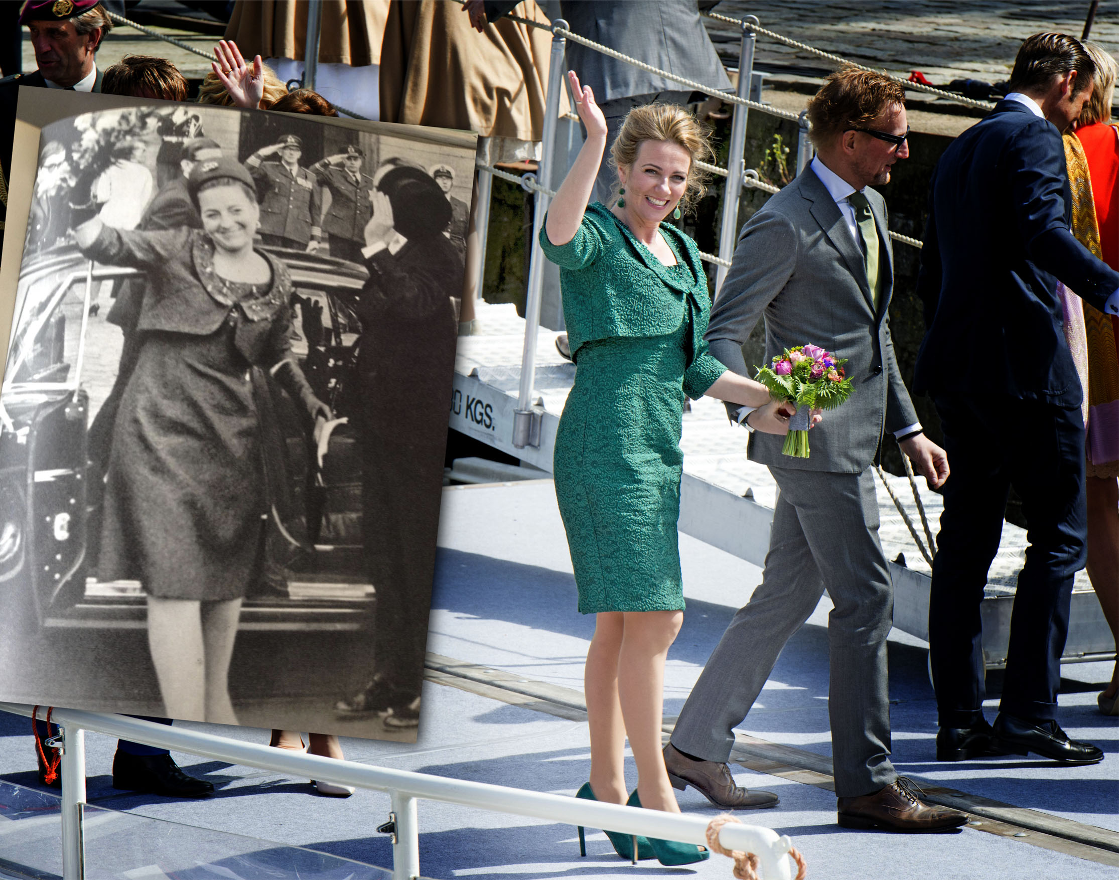 Prinses Annette, de echtgenote van prins Bernhard, bracht tijdens Koningsdag een onopvallend eerbetoon aan haar schoonmoeder. Waar haar familieleden bekende namen uit de modewereld droegen als Missoni, Ted Baker en Natan, koos Annette voor vintage. De smaragdgroene deux-pièces is namelijk zo’n 50 jaar oud en afkomstig uit de kledingkast van prinses Margriet. De jongere zus van prinses Beatrix droeg de creatie met kralen op de revers al eens in 1966, daags voor de huwelijksplechtigheid van prinses Beatrix en prins Claus.