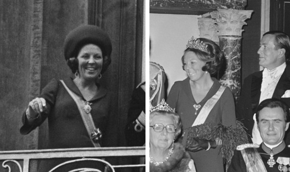 Er is geen uitgebreide studie voor nodig om te constateren dat donkerblauw een van de meest gebruikte kleuren is in Beatrix’ garderobe. Ongeveer 65 blauwe avondjurken passeerden de afgelopen jaren de revue, maar de japon van Prinsjesdag 1975 is met recht een favoriet te noemen. We zagen hem voor het eerst tijdens de opening van de Staten-Generaal in 1975 (links), maar een maand later zagen we de jurk opnieuw tijdens het inkomende staatsbezoek aan Denemarken. (rechts) Ditmaal met honderden kleine veertjes aan de manchetten en de onderzijde van de jurk.
