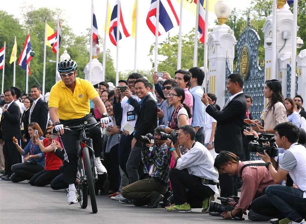 Prayut Chan-o-cha maakte het korte fietstochtje, samen met zijn ministers, bij het regeringsgebouw. Veel medewerkers, fotografen en belangstellenden keken toe hoe de regeringsleider in een geel shirt, en met helm, een rondje maakte op zijn fiets.