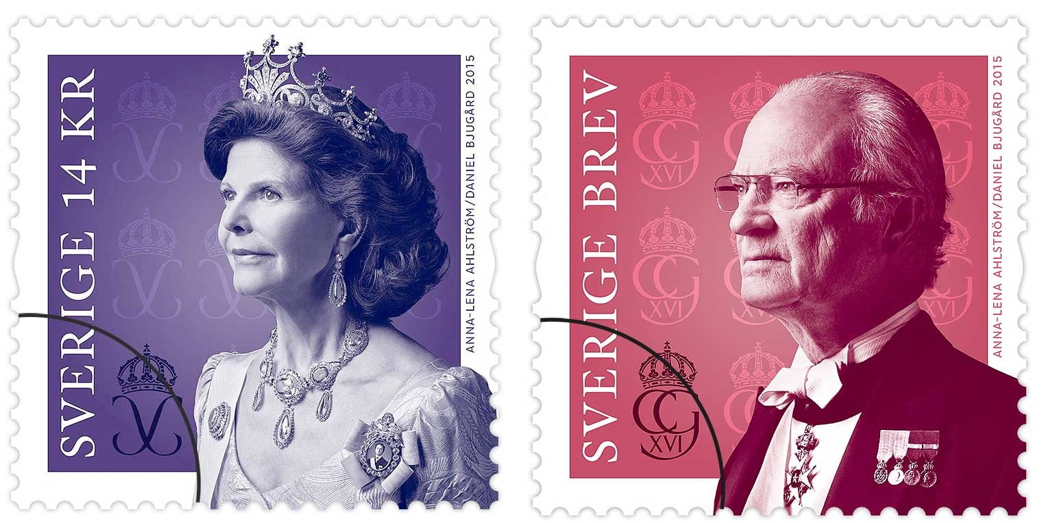 Bjugård voerde de postzegels uit in twee nuances van dezelfde kleur en gebruikte voor de afbeeldingen foto’s van Anna-Lena Ahlström die koning en koningin in het paleis fotografeerde.