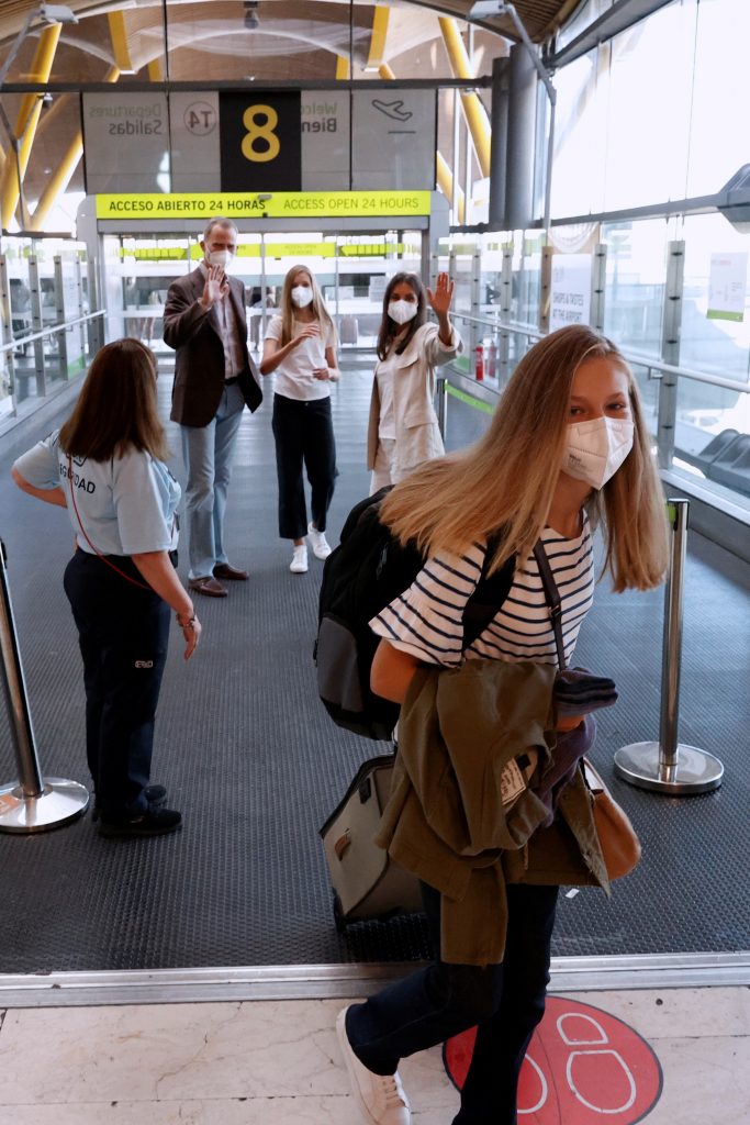 Prinses Leonor is maandag door haar vader koning Felipe, haar moeder koningin Letizia en haar zusje Sofía uitgezwaaid op de luchthaven van Madrid. De oudste dochter van het Spaanse koningspaar vertrok naar Wales voor haar studie.