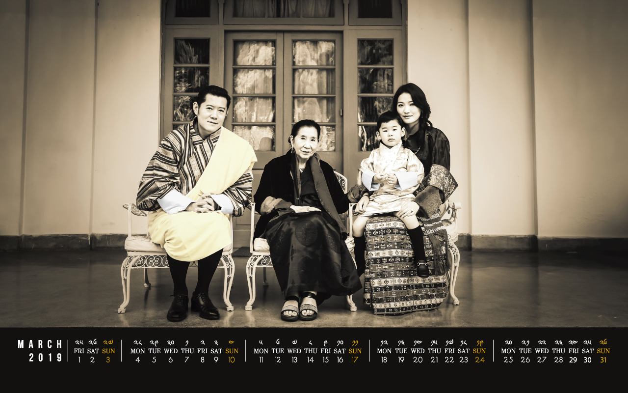 De Bhutaanse koninklijke familie heeft al jaren een digitale kalender. Meestal sieren foto’s of tekeningen van koning Jigme Khesar Namgyel Wangchuck, al dan niet met zijn troonopvolger, de maandkalender. Koningin Jetsun duikt af en toe op, koningin-moeder Tshering Yangdon is zelden te zien.