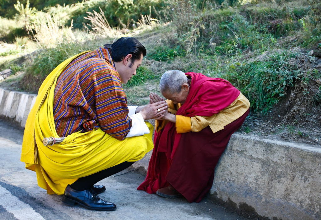 In zijn speech ter ere van zijn kroning doet koning Jigme Khesar enkele beloftes. ‘Ik zal jullie beschermen als een ouder, voor jullie zorgen als een broer en dienen als een zoon. Ik zal jullie alles geven en niks houden. Ik zal zo’n goed leven leiden dat jullie het als voorbeeld zullen zien voor jullie kinderen. Ik heb geen persoonlijke doelen, behalve het vervullen van jullie dromen en wensen. Ik zal altijd dienen, dag en nacht, in de geest van vriendelijkheid, eerlijkheid en gelijkheid.’ Aan deze beloften ligt een fundamentele verantwoordelijkheid ten grondslag die in de Grondwet van Bhutan verankerd is. Jigme Khesar heeft als heilig doel om te zorgen voor kidu, een begrip waar geen goede Nederlandse vertaling voor is. Kidu kan gebruikt worden om welzijn (van de bevolking) uit te drukken, maar diezelfde bevolking kan ook beroep doen op kidu, wat dan weer kan worden uitgelegd als de verantwoordelijkheid van de koning voor dat welzijn. Alles in het werk van de koning moet erom draaien zijn 700.000 onderdanen te helpen waar nodig, met hulp van een Kidu Fonds. Geen overbodige luxe: hoewel de regering goed haar best doet met tegemoetkomingen als gratis onderwijs en gezondheidszorg, is Bhutan nog steeds een arm en onderontwikkeld land. Inwoners kunnen een hulpverzoek indienen, variërend van een tegemoetkoming in studiekosten of een rolstoel voor een ziek kind. Omdat velen niet in staat zijn om naar districtskantoren te komen, laat staan het paleis in hoofdstad Timphu, gaat Jigme Khesar zelf op pad om de aanvragen in ontvangst te nemen. En daarbij stopt de koning met zijn gevolg voor iedere Bhutaan op zijn pad. Hij hoort het verzoek aan, handelt het probleem ter plekke af of laat de administratie over aan zijn hovelingen. Soms zijn er Bhutanen die de koning slechts even in de ogen willen kijken, anderen vragen meer tijd door hun nijpende situaties uit de doeken te doen. Met geduld en compassie staat Jigme Khesar iedereen op zijn pad te woord.