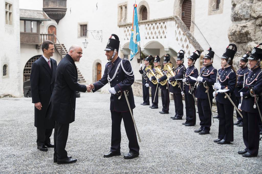 VADUZ – De Liechtensteinse erfprins Alois is maandag en dinsdag gastheer van een staatsbezoek door de Zwitserse president Alain Berset en zijn echtgenote Muriel. Na aankomst in Liechtenstein werd het presidentieel paar begroet op kasteel Vaduz door prins Alois en zijn echtgenote prinses Sophie.