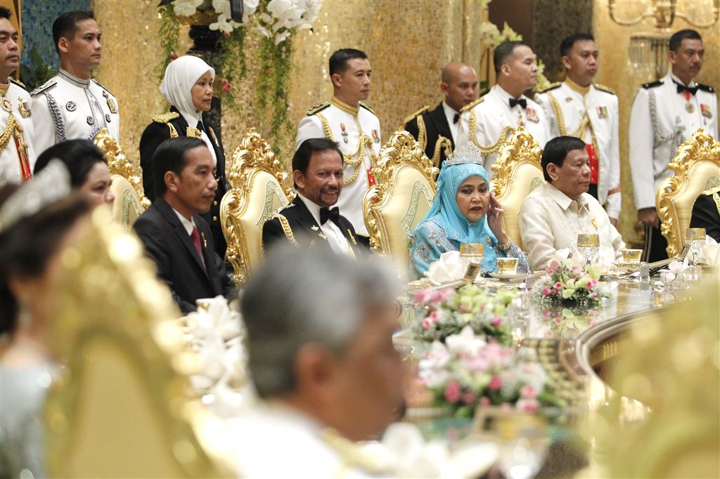 Behalve de sultan en zijn uitgebreide familie zaten aan tafel onder anderen koning Muhammad V van Maleisië, een keur aan Maleisische sultans met hun echtgenotes en een aantal kroonprinsen, de presidenten van Indonesië en de Filipijnen, de premiers van Thailand, Maleisië en Singapore, vertegenwoordigers van de Golfstaten en prins Edward en vrouw Sophie namens koningin Elizabeth.