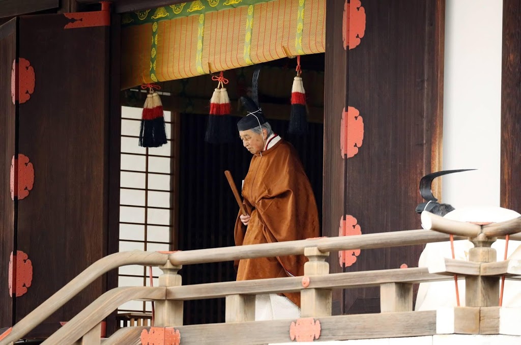 Eerder dinsdag had keizer Akihito, gekleed in het traditionele ‘sokutai’ gewaad, nog een laatste bezoek gebracht aan het Kashikodoro heiligdom op het paleisterrein. Daar las hij een boodschap voor aan de zongodin Amaterasu, volgens legende de stichter van het keizershuis. Hij vertelde haar van zijn voornemen tot aftreden. Het is voor het eerst sinds 1817 dat een Japanse keizer is afgetreden. Er was een speciale wet voor nodig om dat mogelijk te maken