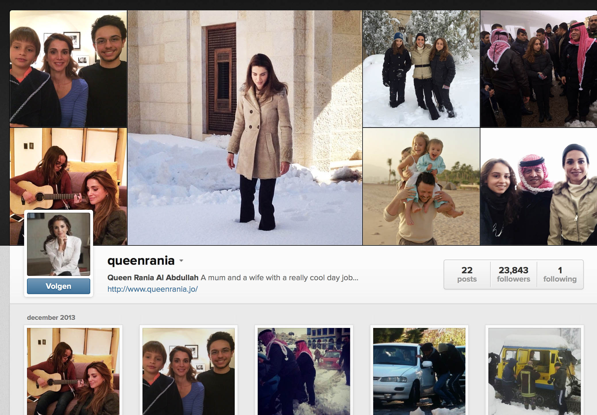 Bij een foto van zichzelf met één van haar dochters die gitaar speelt, schreef Rania als commentaar: “Ontspannen met haar liedjes na een lange dag werken.” Ook staat ze op de foto met haar twee zoons. Op de eerste foto’s die ze postte, is de koningin te zien bij de herdenking van Nelson Mandela in Zuid-Afrika, met onder anderen president Barack Obama en oud-president Bill Clinton.