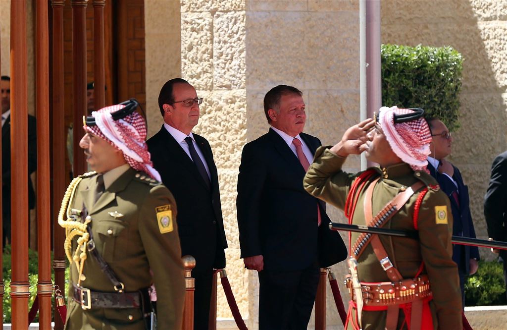 François Hollande is dinsdag aangekomen in Jordanië. De Jordaanse koning Abdullah II verwelkomde de Franse president op het Koninklijk Paleis in Amman, waar Hollande eerst de erewacht inspecteerde.