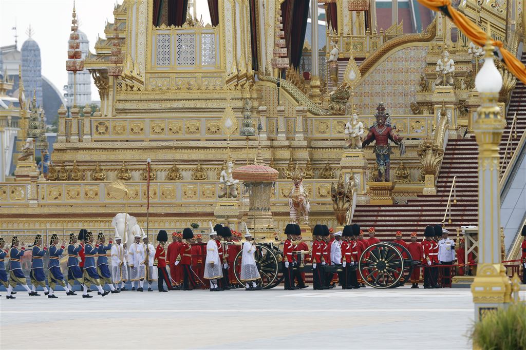 De processie met het lichaam van de vorig jaar overleden Thaise koning Bhumibol is aangekomen bij de speciale plaats waar de crematie zal plaatsvinden. Het binnenbrengen van het stoffelijk overschot ging gepaard met een aantal strikt omschreven rituelen.