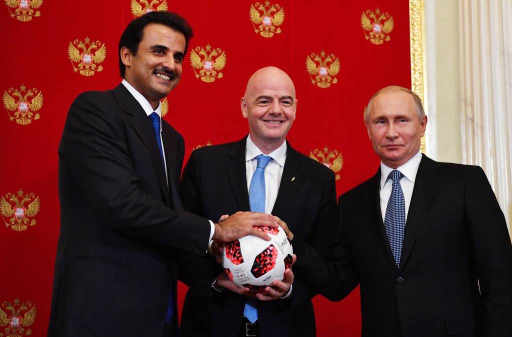 De Russische president Vladimir Poetin heeft enkele uren voor de aftrap van de finale van het WK voetbal in Moskou symbolisch de organisatie van het WK overgedragen aan de emir van Qatar. De president overhandigde een voetbal aan sjeik Tamim bin Hamad al-Thani.
