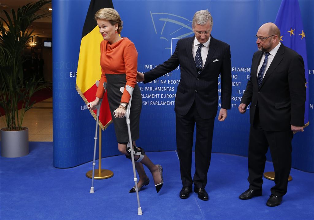 BRUSSEL – De Belgische koningin Mathilde loopt op krukken. De vrouw van koning van Filip dook op in Brussel met een kniebrace.