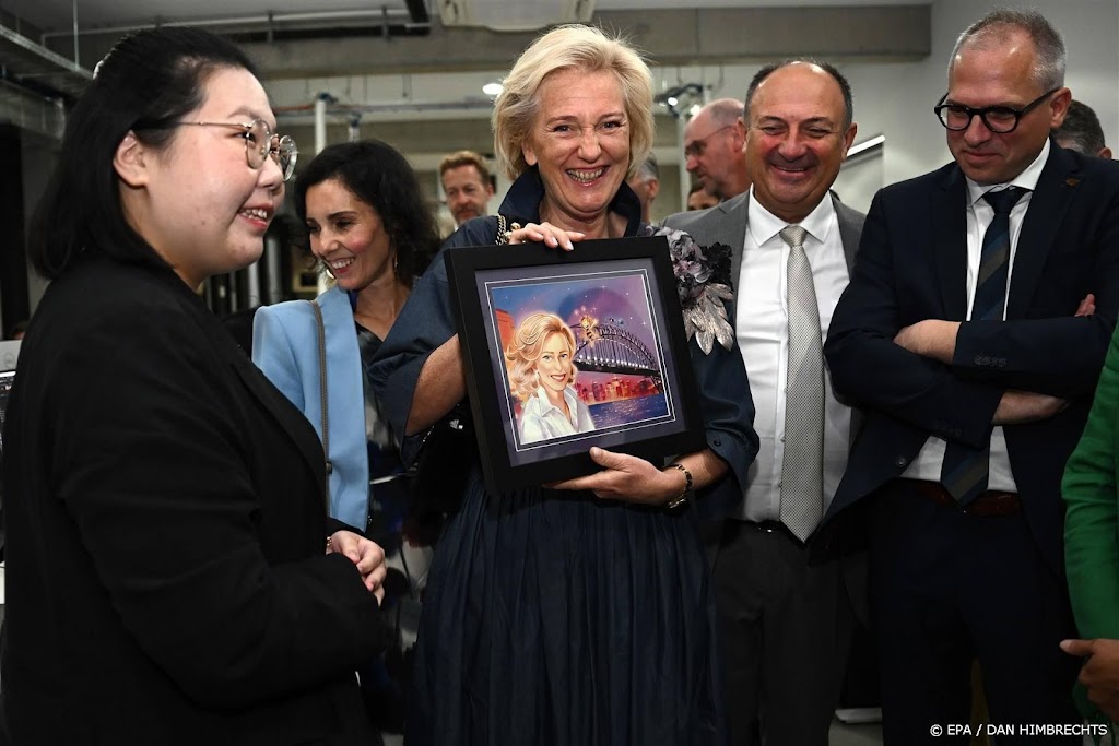 Kunstenares Jihee Park tekende de zus van koning Filip voor de beroemde Harbour Bridge in Sydney. Astrid reageerde lachend en enthousiast op haar kleurrijke portret, is te zien op foto’s.