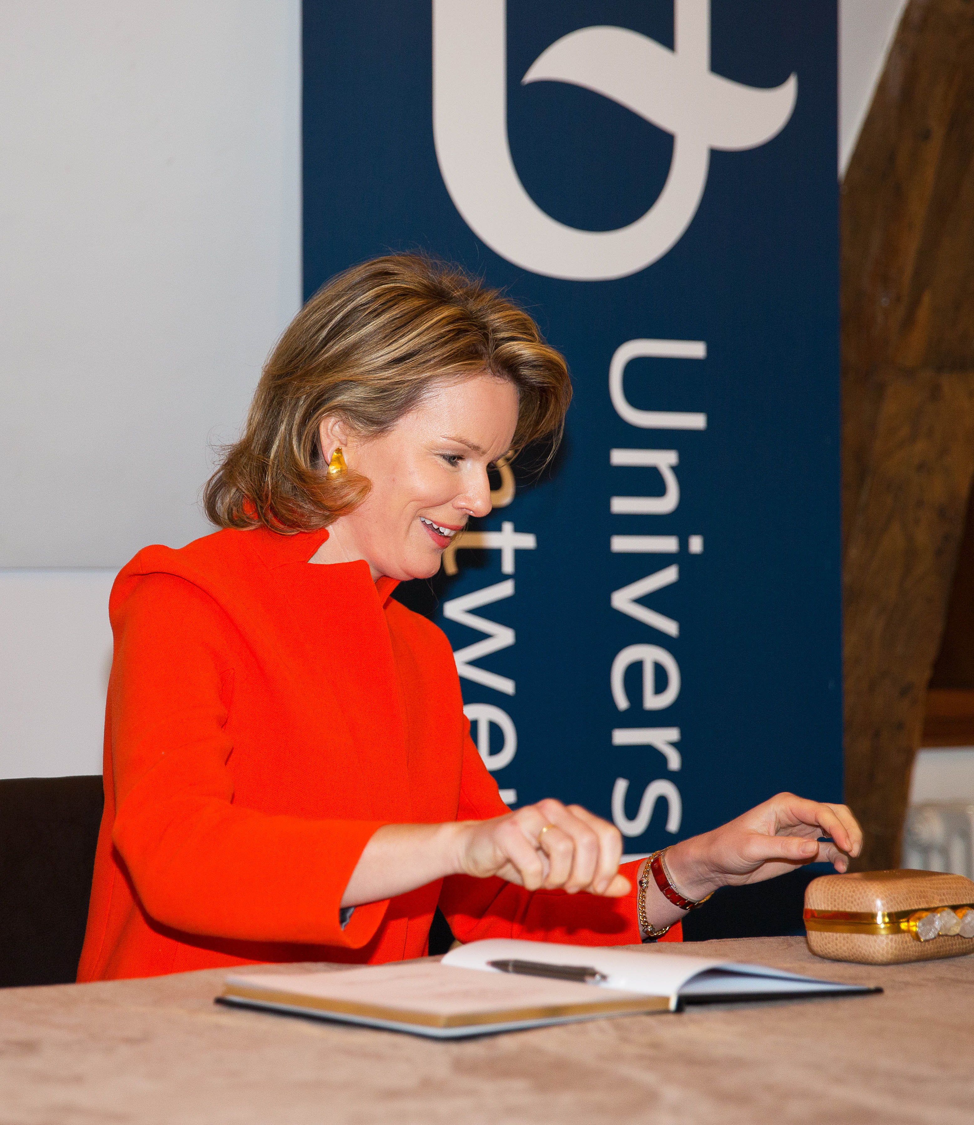 De kledingstijl van koningin Mathilde van België werd in het verleden nog wel eens omschreven als stijf en tuttig, maar heeft de afgelopen maanden een behoorlijke ontwikkeling ondergaan. De kleuren worden feller, het materiaal gewaagder en ook de veilige keuzes wat betreft accessoires blijven steeds vaker achterwege. Zo droeg de koningin vandaag een felrood mantelpakje, gecombineerd met gouden oorbellen en pumps in diverse kleurstellingen. Op de redactie van Vorsten waren we erg enthousiast over de look van Mathilde. Wat vindt u van haar kledingkeuze?