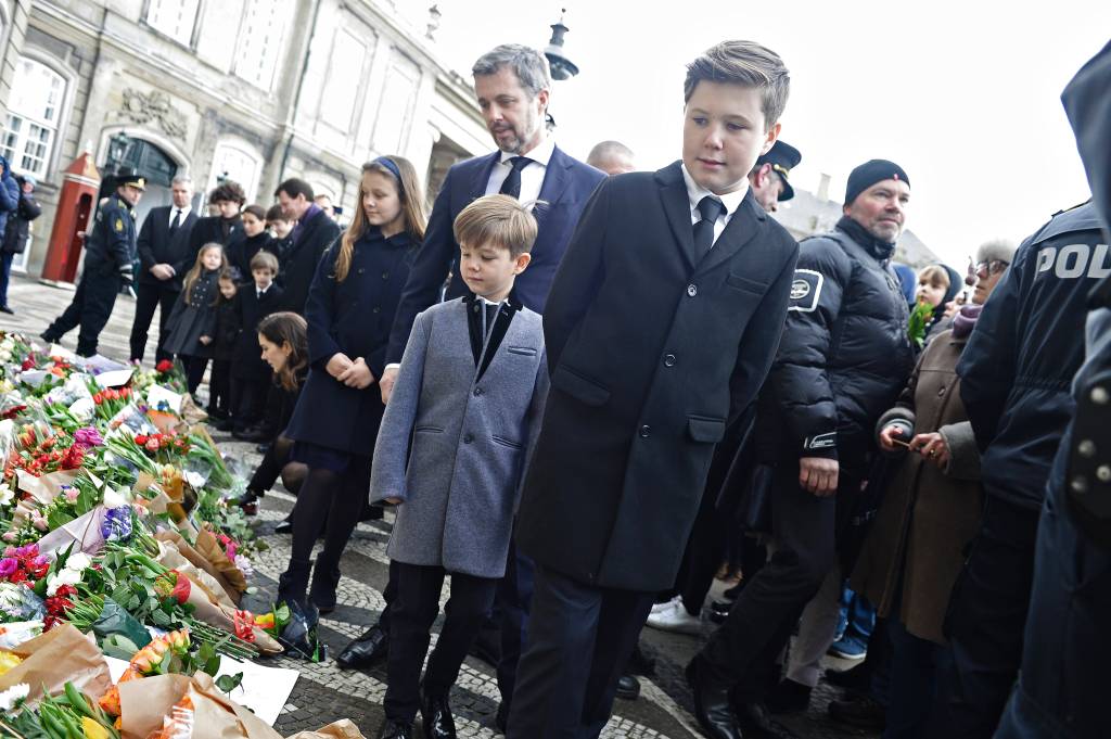 Kroonprins Frederik, kroonprinses Mary en hun kinderen namen na aankomst van de rouwstoet in Kopenhagen een kijkje bij de bloemenzee voor de ingang van paleis Amalienborg.