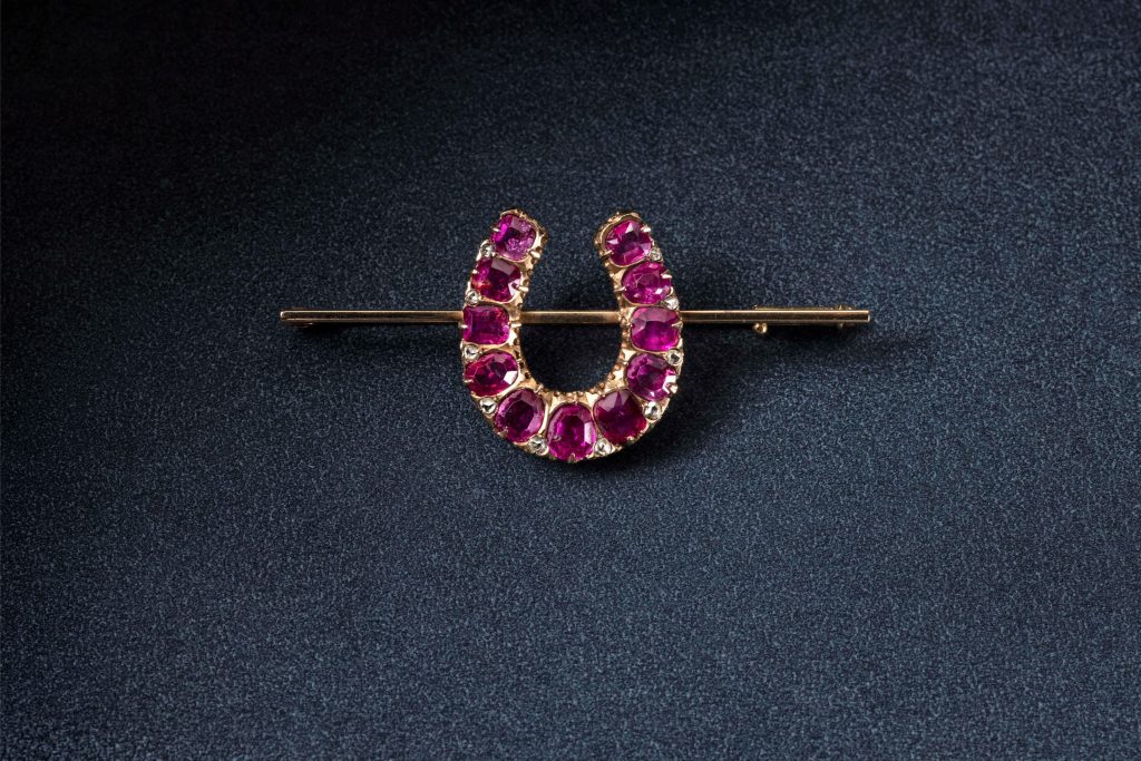 Haar keuze voor bepaalde juwelen bij een bepaalde gelegenheid bleek al op 15 januari 1972, weet juwelendeskundige Martijn Akkerman. ‘Een dag nadat haar vader was overleden, werd Margrethe officieel gepresenteerd als koningin. Geheel in rouw droeg zij een kleine broche in de vorm van een hoefijzer, bezet met diamantjes en robijntjes, een gelukssymbool, met de opening naar boven gericht, ‘opdat het geluk er niet uit kan vallen’. Deze broche kreeg ze van haar vader naar aanleiding van de grondwetsherziening in 1953, waarbij de zogenoemde Salische wet, die exclusief mannelijke opvolging voorschreef, werd geschrapt en Margrethe officieel vermoedelijk troonopvolger werd.’
