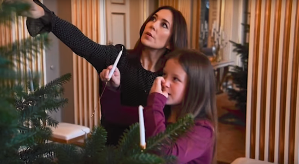 Prins Christian (12), prinses Isabella (10) en de tweeling prins Vincent en prinses Josephine (6) hingen met behulp van hun ouders echte kaarsjes in de naaldboom. Frederik staat daarbij op een ladder. De video wordt veel gedeeld en krijgt veel likes.