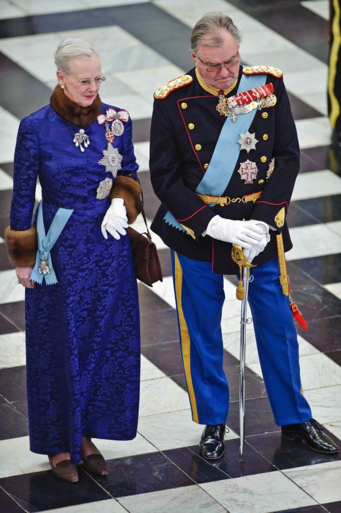 Het Deense hof laat weten dat de nieuwe jurk de vervanger is voor de eerdere donkerblauwe jurk, die de koningin 25 jaar geleden kreeg en die hieronder te zien is. De 82-jarige Margrethe ontving de rode jurk ter ere van haar 50-jarig regeringsjubileum vorig jaar.
