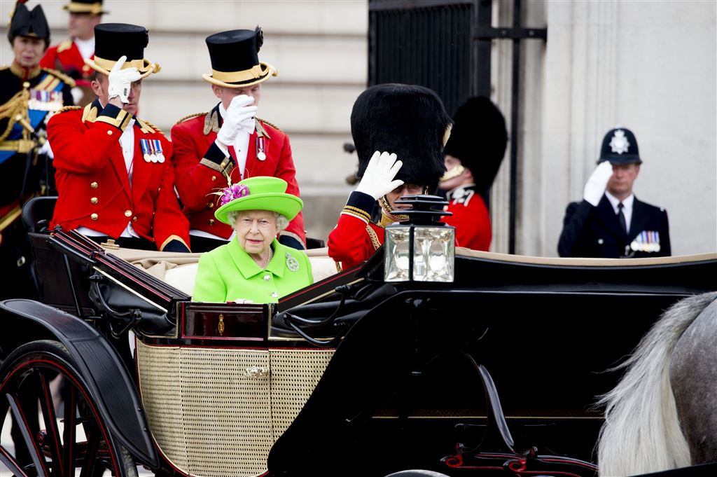 De koningin was voor de gelegenheid in helder groen gekleed met bijpassende hoed. Aan haar zijde zat echtgenoot prins Philip (95) met garde-uniform en een muts van berenvel. Aansluitend nam de koningin onder een bewolkte hemel de traditionele parade ‘Trooping the Colour’ af.