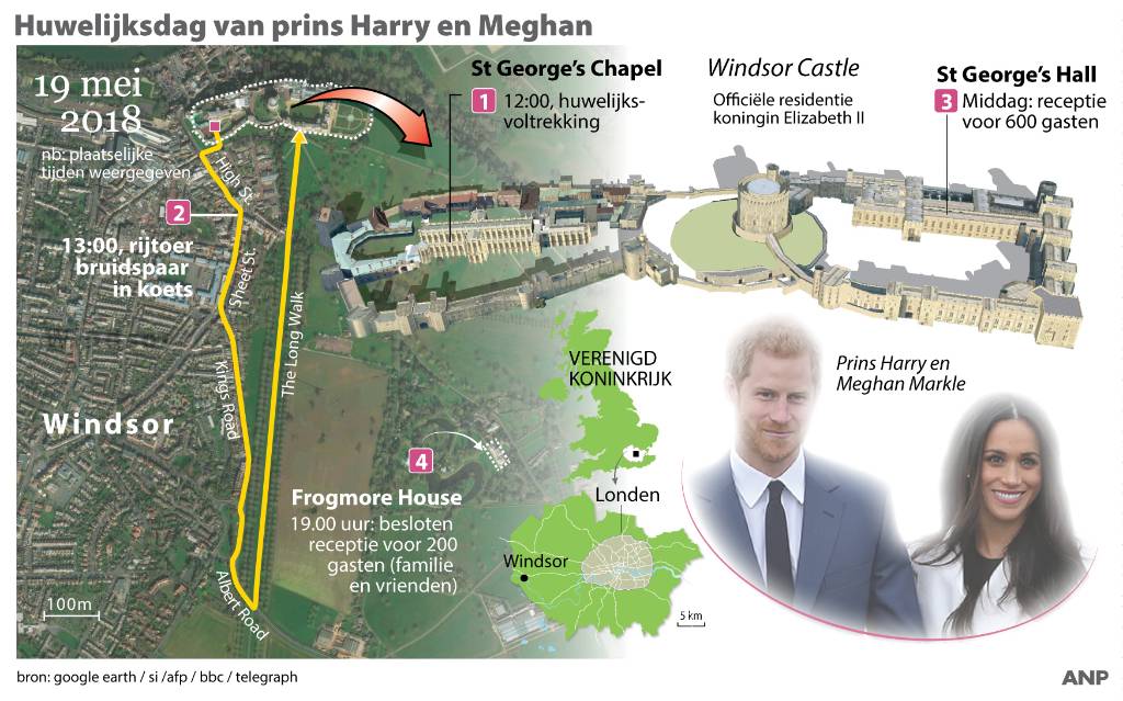 Bij de bruiloft zijn nauwelijks buitenlandse royals. Harry is ‘maar’ zesde in lijn van troonopvolging, in tegenstelling tot de trouwerij van zijn broer William is de bruiloft zaterdag geen staatsaangelegenheid. Bovendien is St George’s Chapel niet zo groot.