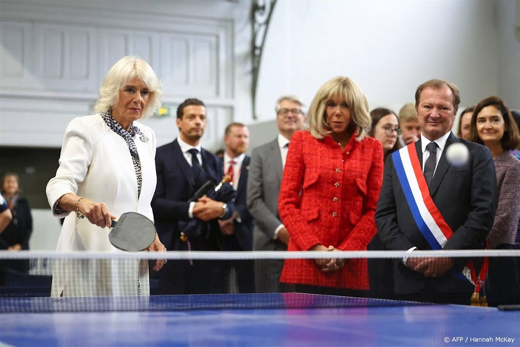 De Britse koningin Camilla heeft tijdens het staatsbezoek aan Frankrijk een partijtje tafeltennis gespeeld met Brigitte Macron, de vrouw van president Emmanuel Macron. Dat gebeurde tijdens een bezoek aan het sportcentrum in Saint-Denis.