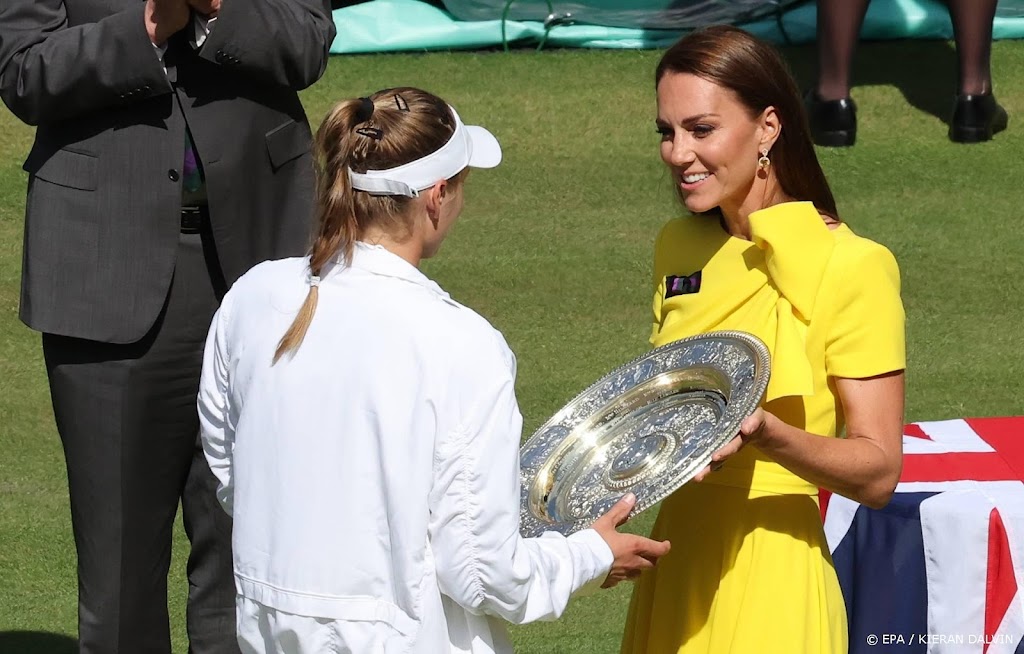 Catherine, de hertogin van Cambridge, heeft zaterdag de prijs uitgereikt aan het einde van het vrouwentoernooi van Wimbledon. De vrouw van prins William overhandigde op het Centre Court de winnaarstrofee aan Elena Rybakina uit Kazachstan, die in de finale te sterk was voor de Tunesische tennisster Ons Jabeur.