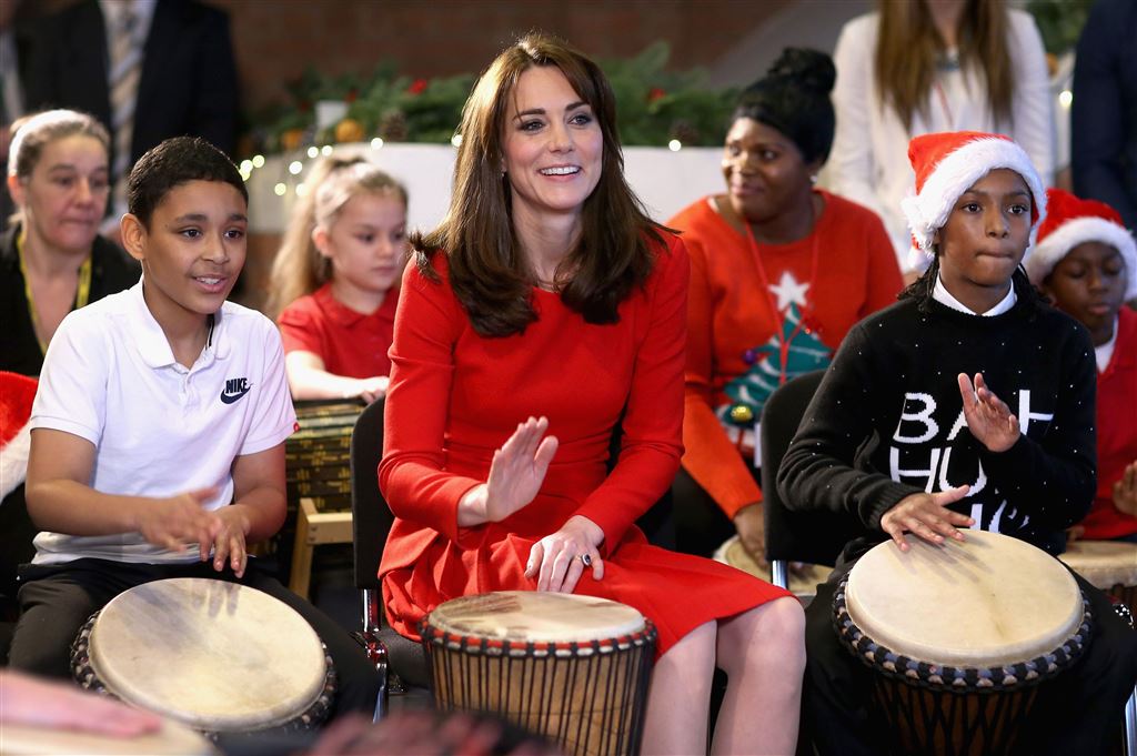 Volgens The Telegraph bleef de hertogin een kwartier bij de drumles van de kinderen, waarbij ze onder meer We Will Rock You van Queen speelden. Daarna sprak ze verder met kinderen terwijl zij kerstversiering knutselden voor een collage aan de wand.