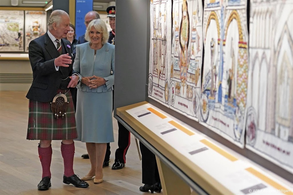 Tijdens de tweede kroning van de Britse koning Charles (74) in het Schotse Edinburgh, werden hij en zijn echtgenote koningin Camilla (75) met verschillende activiteiten herinnerd aan oude ambachten van het land. Zo nam Camilla een kijkje in de borduurkamers van een tapijtenatelier. Daar werkte ze ook even mee aan een wandtapijt dat ze cadeau kregen, is te zien op foto’s die het Britse hof donderdag deelde.