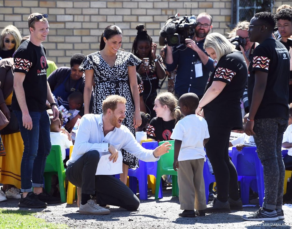 Twee jonge inwonertjes van de sloppenwijk kregen Harry en Meghan aan het dansen. De kereltjes lieten de Sussexes ook zien hoe de jeugd elkaar begroet in het township. Zij lieten de hertog en hertogin zien hoe zij elkaar altijd eerst een dubbele high-five geven en daarna een boks.