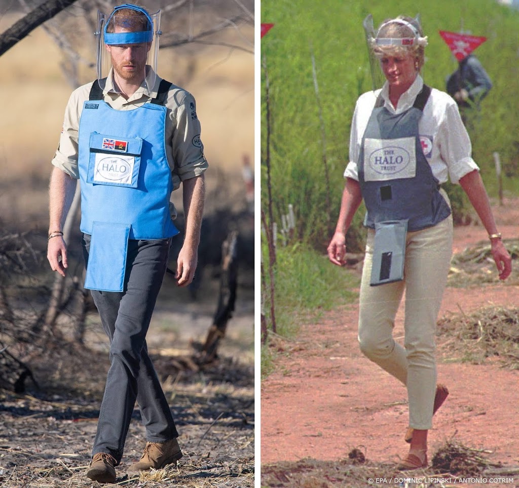 Diana bezocht in 1997 het landmijnenveld in Huambo. Net als op de beroemde foto’s die destijds van zijn moeder werden gemaakt, werd Harry vrijdag ook in Angola op vrijwel dezelfde wijze vastgelegd terwijl hij in beschermende kleding over het veld liep.