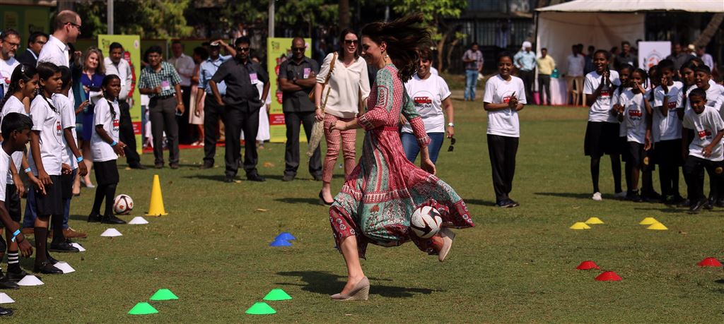 Er werd overigens ook nog een partijtje voetbal gespeeld en ook daar liet Kate zich niet onbetuigd. Een paar kinderen leerden Kate ook nog in Hindi van een tot vijf tellen.