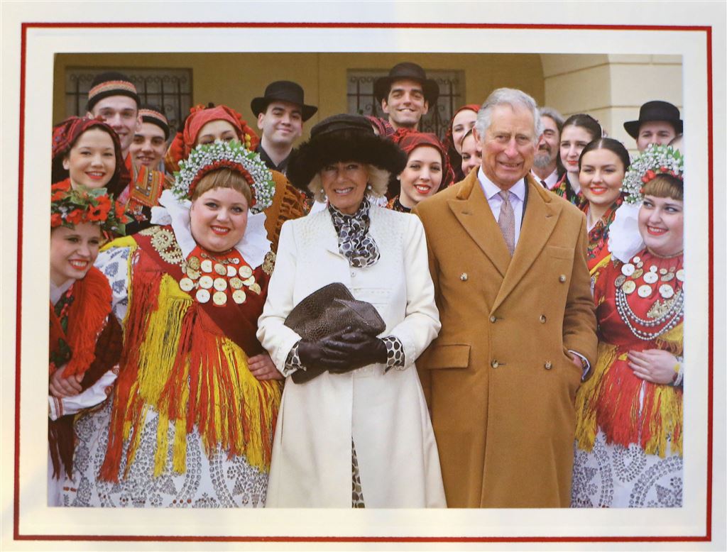 De foto toont Charles en Camilla tijdens hun officieel bezoek eerder dit jaar aan Kroatië. Ze poseren met een Kroatisch-Slavonische volksdansgroep, die op de markt van Osijek een voorstelling gaven voor de Britse bezoekers. .
