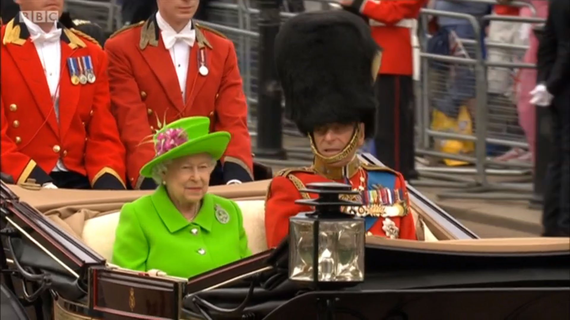 De Britse koningin Elizabeth is zaterdag het middelpunt tijdens de ceremonie Trooping the Colour in Londen. Met deze traditionele parade wordt haar 90e verjaardag officieel gevierd. De parade is één van de vele activiteiten dit weekend ter ere van de verjaardag van de vorstin.