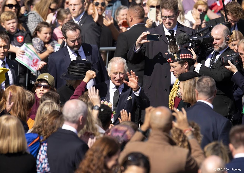Koning Charles en William praten met mensen die wachten in rij