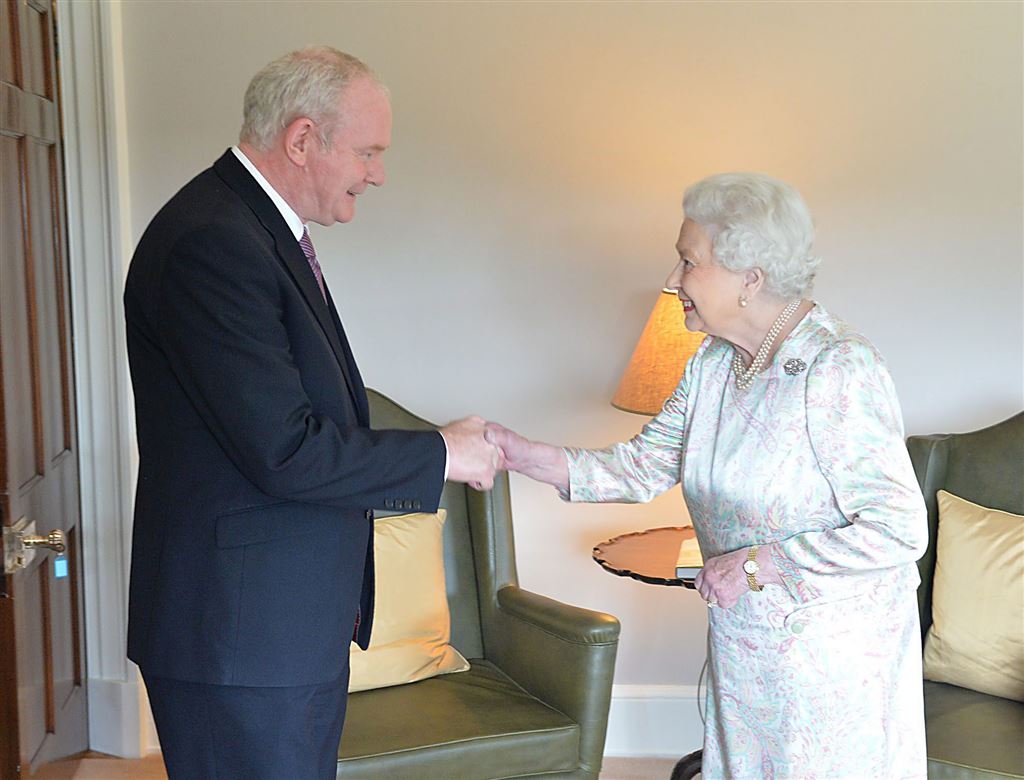 “Goeiedag, hoe maakt u het?” vroeg de Noord-Ierse vicepremier Martin McGuinness, toen hij de monarch onder het oog van de camera’s de hand gaf. “Wel, ik leef nog”, antwoordde de negentigjarige koningin gevat. “Wij hebben het zeer druk gehad, er is veel gebeurd.”
