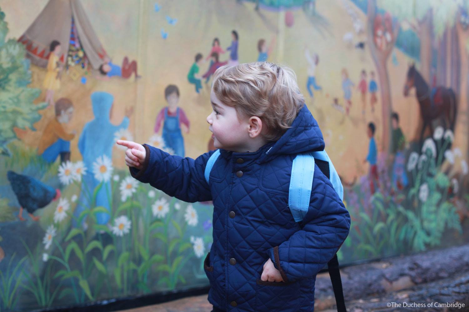 George nam zijn spulletjes mee in een lichtblauwe rugzak, die goed past bij zijn donkerblauwe jas. Zijn moeder Catherine maakte de foto’s die werden gedeeld via Twitter en Instagram.