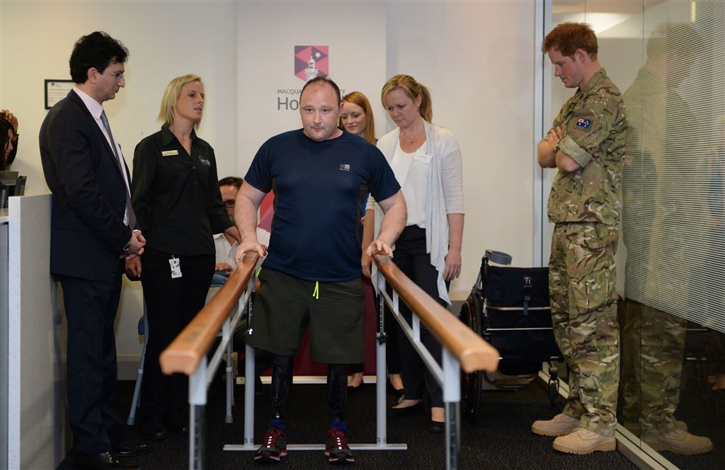 SYDNEY – Prins Harry was donderdag in Sydney in het Macquarie University Ziekenhuis. Hij bracht er een bezoek aan de Britse soldaat luitenant Alistair Spearing die in het ziekenhuis leert lopen met beenprotheses.