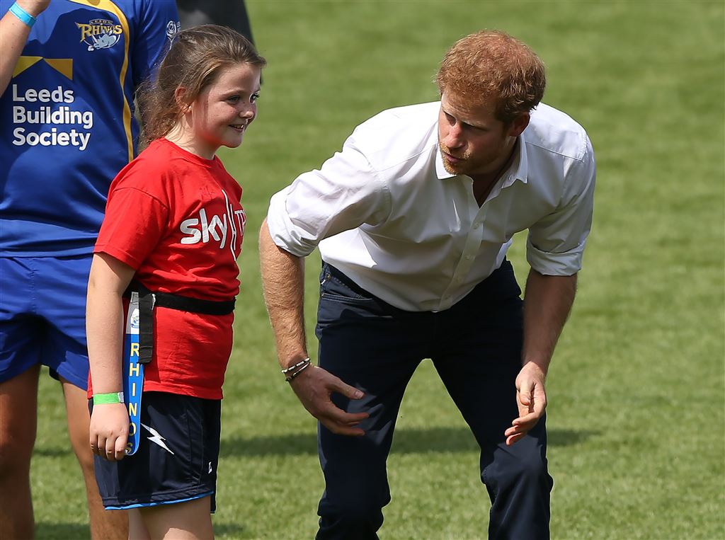 Harry deed zijn bijdrage bij het uitdelen van de lunchpakketjes maar maakte bij de jongens en meisjes vooral indruk toen hij meespeelde en -coachte tijdens een potje handbal.