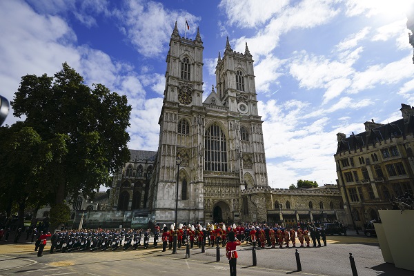 De kist van koningin Elizabeth wordt na de uitvaartplechtigheid met een processie van Westminster Abbey naar de triomfboog Wellington Arch gebracht. De dienst werd beëindigd met het zingen van het Britse volkslied. Achter de kist lopen onder anderen koning Charles, prins William en prins Harry. Bij Wellington Arch gaat de kist in de lijkwagen naar Windsor Castle.