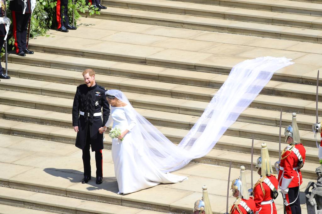 Meghan koos verrassend voor Clare Waight Keller, verbonden aan Givenchy, als ontwerpster van haar trouwjurk. In overleg met de bruid maakte de Britse ontwerpster een eenvoudige, zijden jurk met boothals. Op de bijna vijf meter lange sluier, waaraan langer is gewerkt dan aan de jurk, stonden ruim vijftig bloemen als symbolen voor de landen van het Gemenebest der Naties.