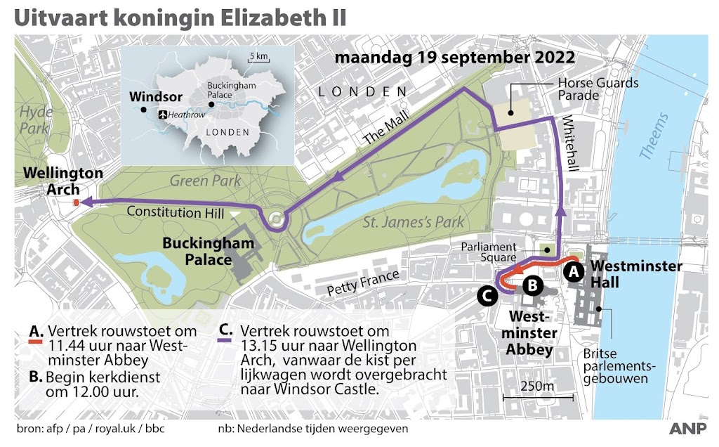 In het Verenigd Koninkrijk wordt maandag afscheid genomen van koningin Elizabeth. In Westminster Abbey in Londen wordt haar staatsbegrafenis gehouden. Daarna wordt de vorstin naar Windsor Castle, haar laatste rustplaats, gebracht.