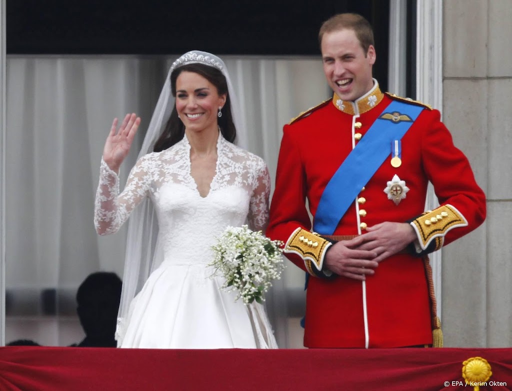 “We wensen de hertog en hertogin van Cambridge een hele fijne trouwdag vandaag! De koninklijke hoogheden trouwden in de Abbey op deze dag in 2011”, schrijft iemand van de kerk op Twitter. Bij het bericht plaatst de kerk een foto waarop het kersverse bruidspaar de kerk weer verlaat. Op de achtergrond staan enkele bruidskinderen en prins Harry, de broer van William.